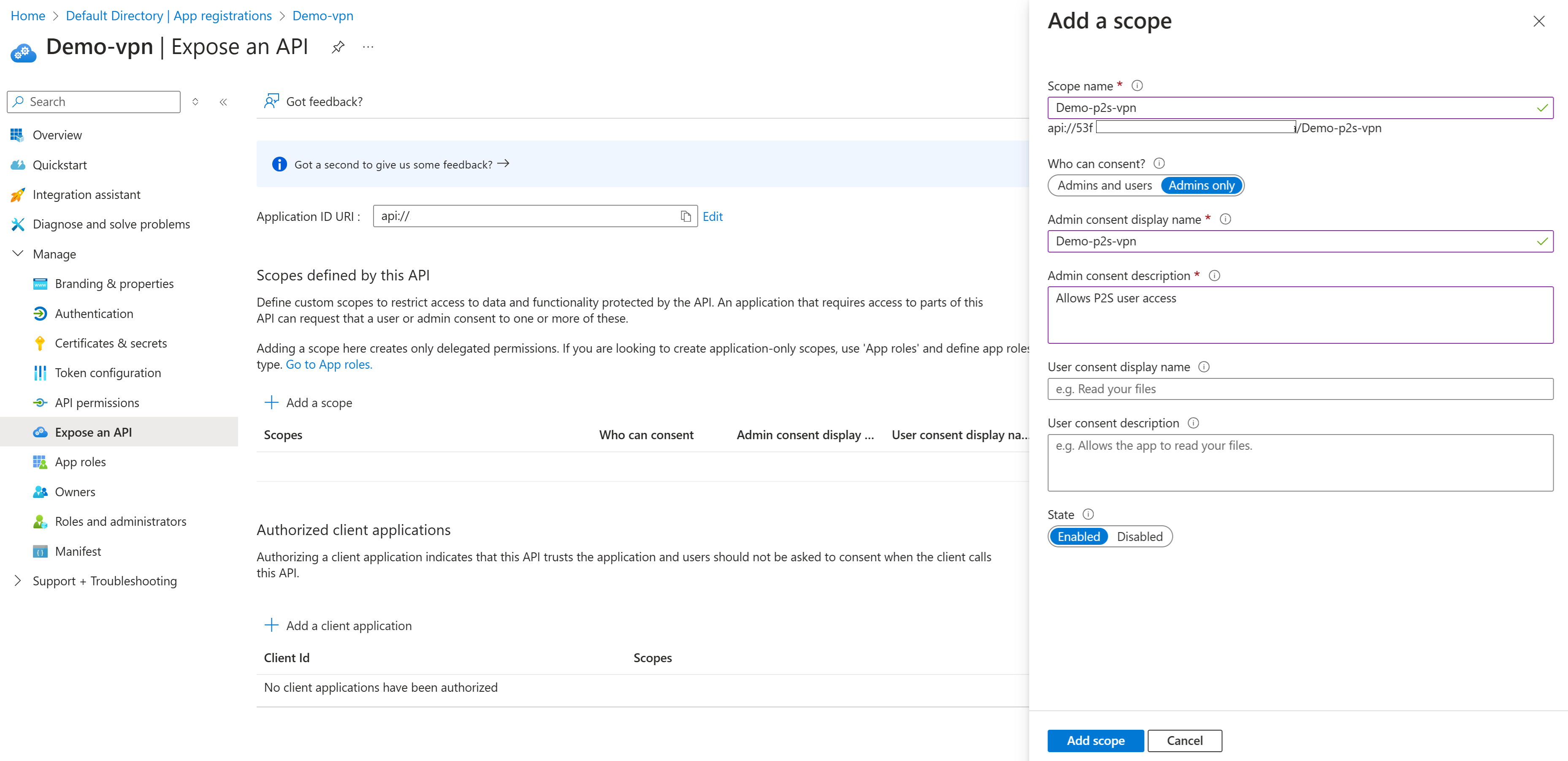 字段 值 范围名称 示例:p2s-vpn1 谁可以许可 仅限管理员使用 管理员许可显示名称 示例:p2s-vpn1-users 管理员许可说明 示例:访问 P2S VPN State 已启用 选择“添加范围”以添加范围。