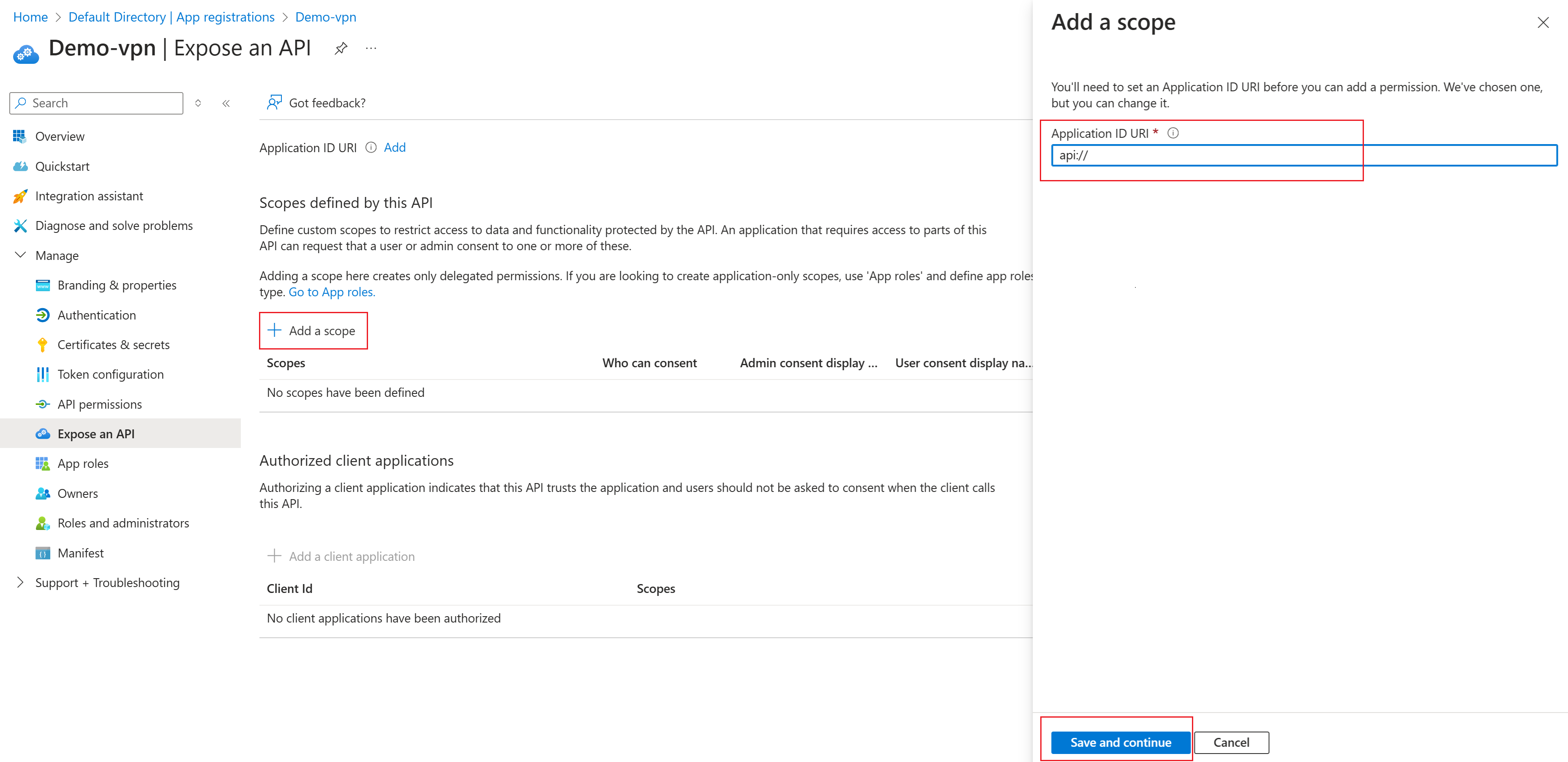 api://<application-client-id>。 应用 ID URI 充当你在 API 代码中引用的范围的前缀,它必须是全局唯一的。选择“保存并继续”以转到下一个“添加范围”窗格。