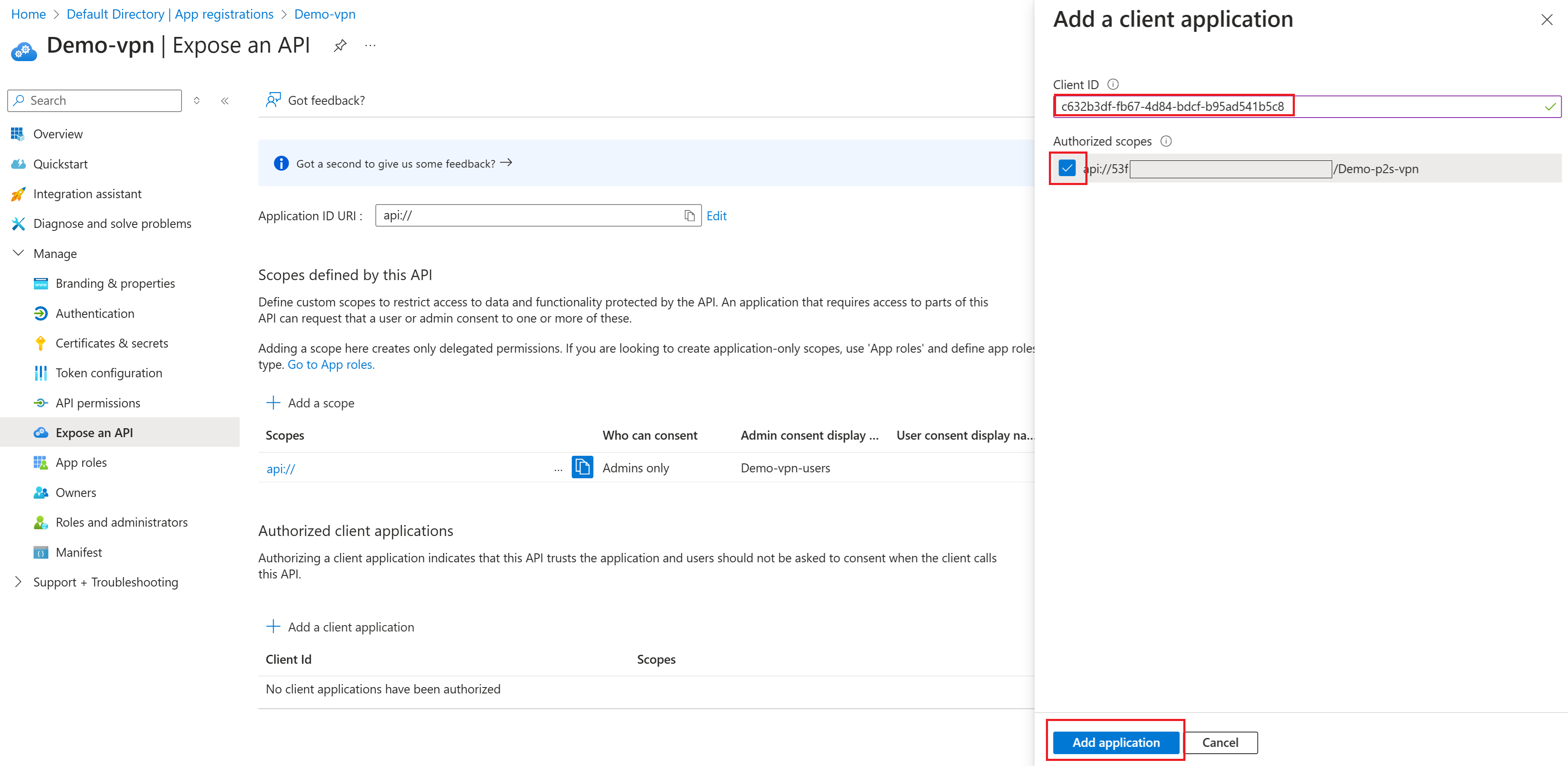 在以下步骤中,使用Microsoft注册的 Azure VPN 客户端应用 ID 受众值添加另一个授权客户端应用程序。 不会更改现有授权客户端应用程序的值。 如果不再使用它,始终可以删除现有的授权客户端应用程序。