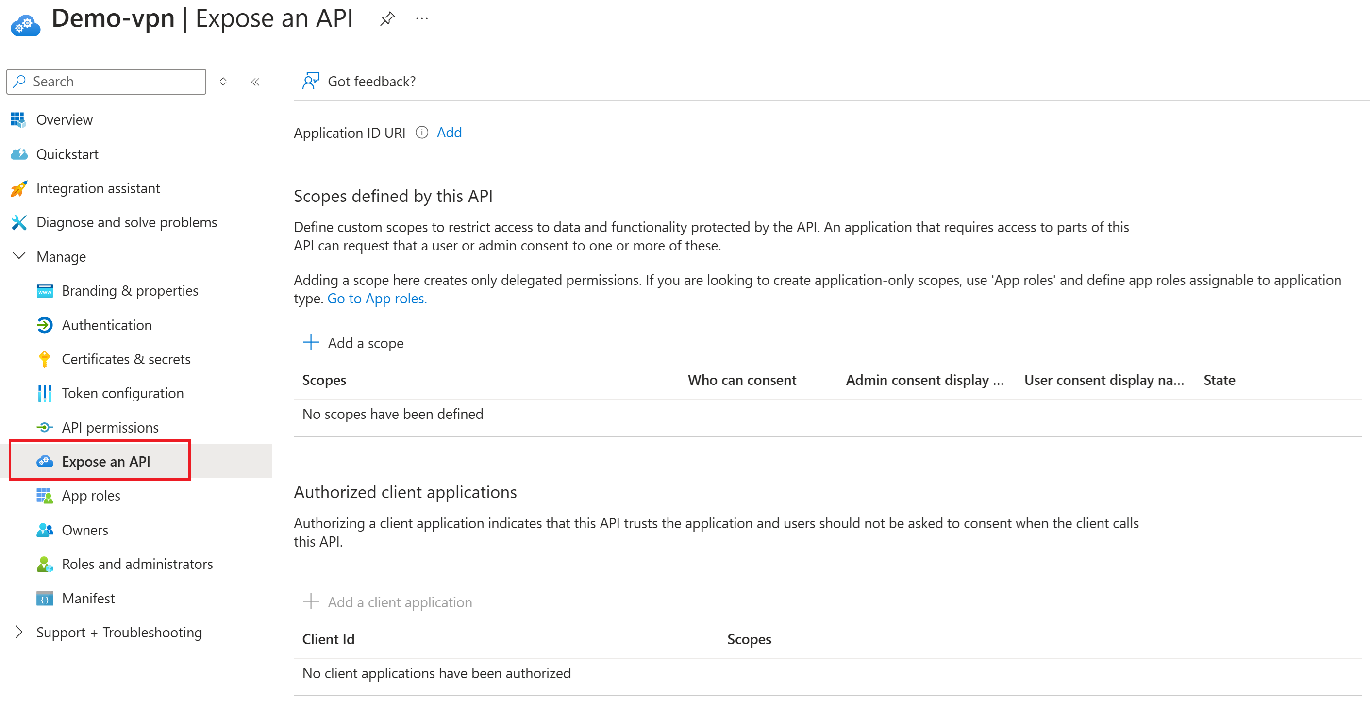 单击“公开 API”。 在 “公开 API ”页上,请注意以前的 Azure VPN 客户端受众值