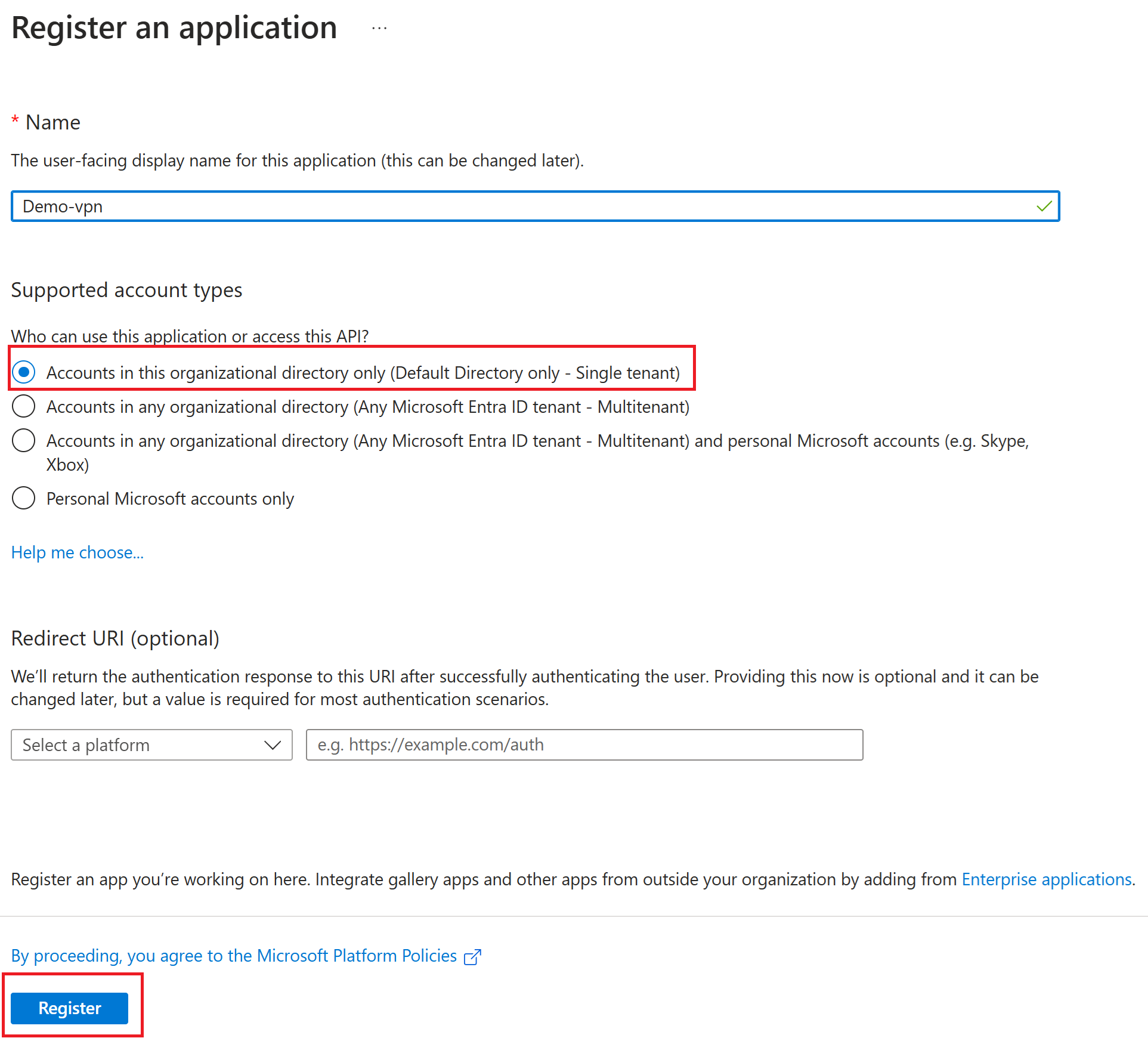 本文提供大致步骤。 注册应用程序的屏幕截图可能会略有不同,具体取决于你访问用户界面的方式,但设置相同。 有关详细信息,请参阅快速入门:注册应用程序。 有关 P2S 的 Microsoft Entra ID 身份验证的更多信息,请参阅 P2S 的 Microsoft Entra ID 身份验证。