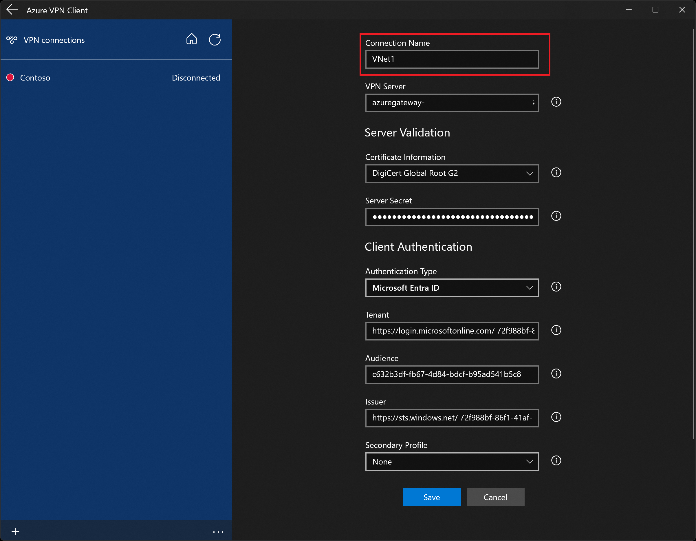 更改连接名称(可选)。 在此示例中可以看到,显示的受众值是与 Microsoft 注册的 Azure VPN 客户端应用 ID 关联的值。 此字段中的值必须与 P2S VPN 网关配置使用的值一致。