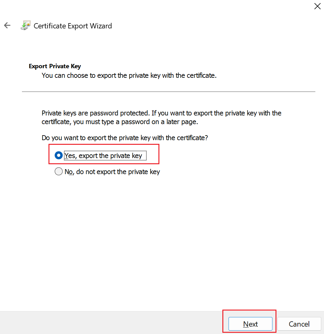 在“导出文件格式” 页上,保留选择默认值。 请务必选中“包括证书路径中的所有证书(如果可能)”。 此外,此设置还会导出成功客户端身份验证所需的根证书信息。 否则,客户端身份验证会失败,因为客户端没有受信任的根证书。 然后单击“下一步”。
