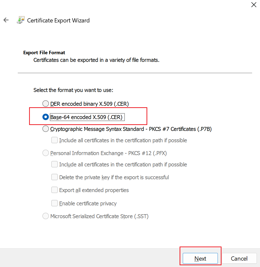 在“导出文件格式”页上,选择“Base-64 编码的 X.509 (.CER)”,然后选择“下一步”。