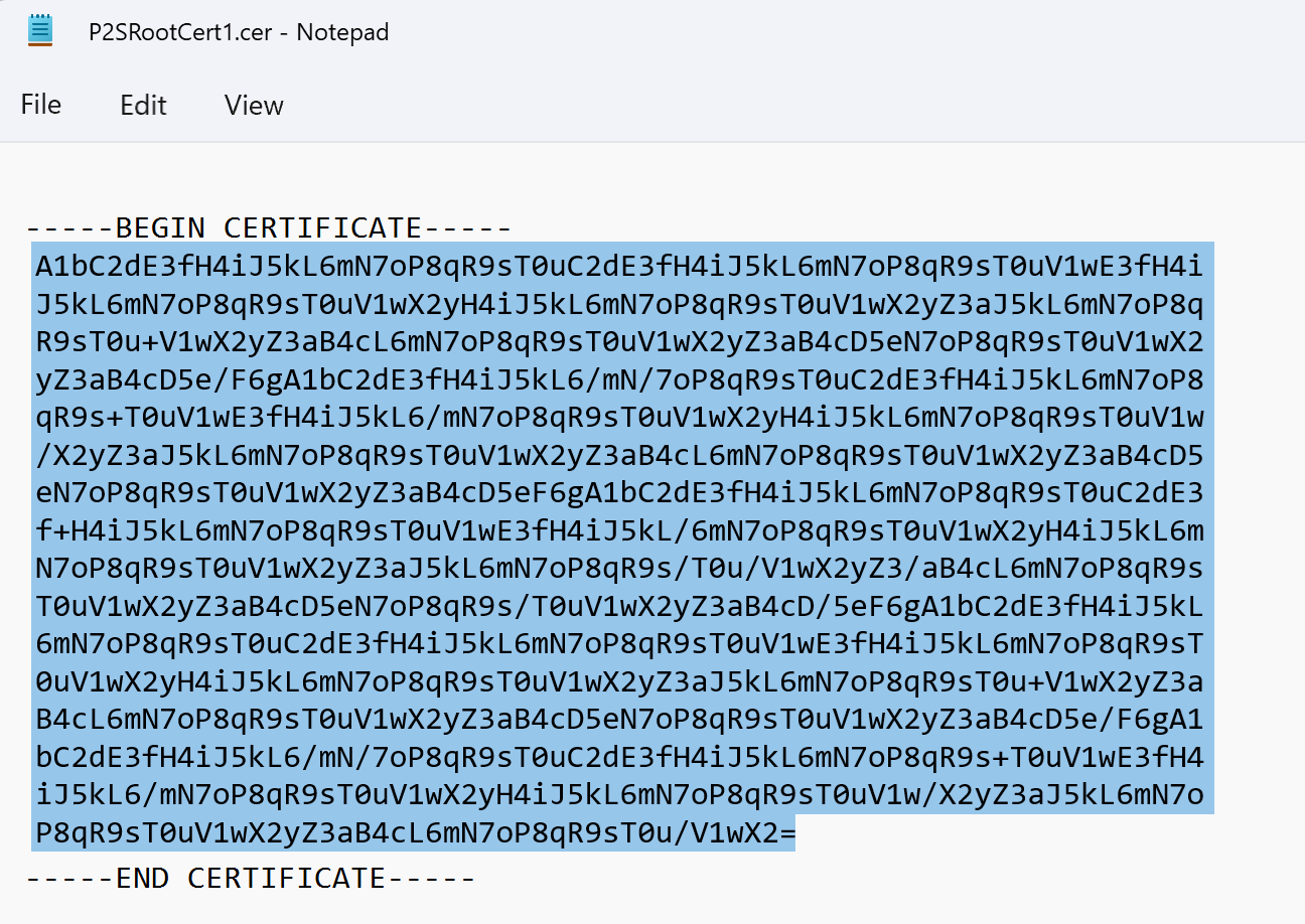 如果文件内容与示例不同,这通常意味着你没有使用 Base-64 编码的 X.509(.CER) 格式将其导出。 此外,如果使用记事本以外的文本编辑器,需了解,某些编辑器可能会在后台引入非预期的格式设置。 将此证书中的文本上传到 Azure 时,这可能会产生问题。