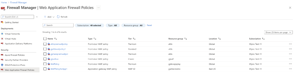 在 Azure 防火墙管理器中,可以在一个中心位置跨订阅和区域创建和查看所有 WAF 策略。