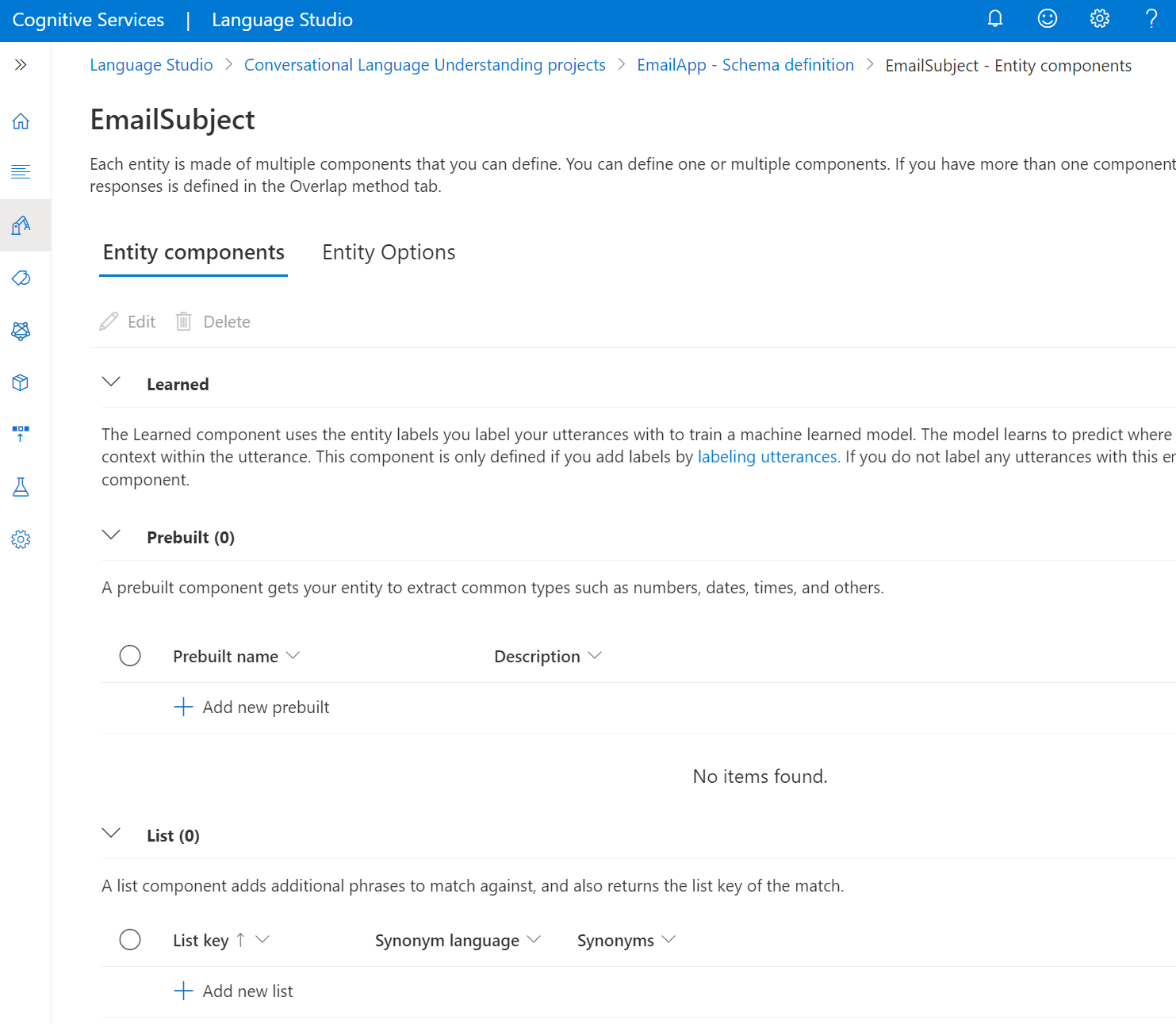 选择实体详细信息页上的 “实体选项 ”选项卡。 为实体定义多个组件时,其预测可能会重叠。 发生重叠时,将根据在此步骤中选择的 实体选项 确定每个实体的最终预测。 选择要应用于此实体的选项,然后选择“ 保存”。