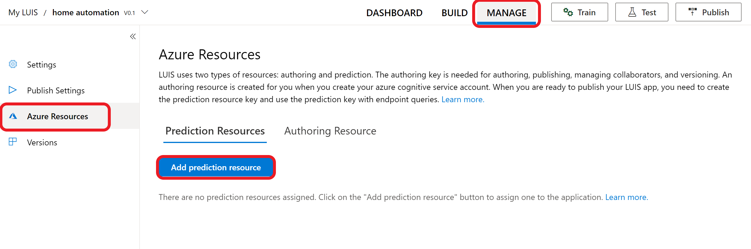 目前,你完成了应用程序的创建。 你需要创建一个预测资源来发布应用程序,从而通过预测终结点在聊天机器人或其他客户端应用程序中接收预测结果
