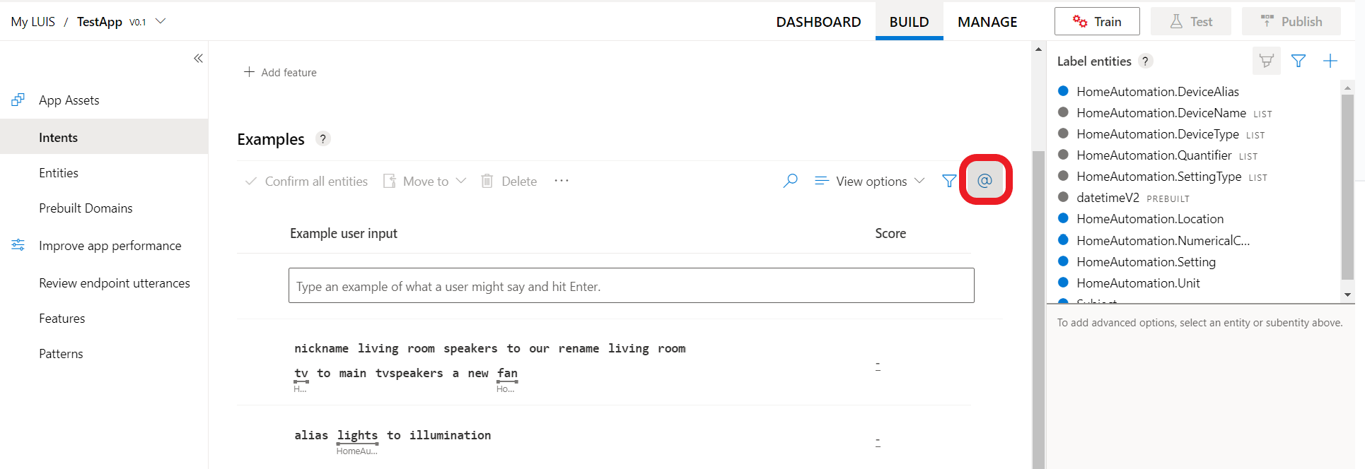 在左窗格中选择 “意向 ”以查看 HomeAutomation 域意向。 它具有示例言语,例如