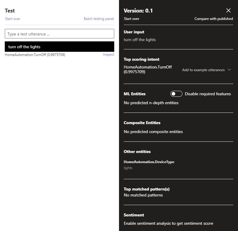 在“交互式测试”窗格中键入测试言语,然后按 Enter。 例如,“关闭照明设备”。