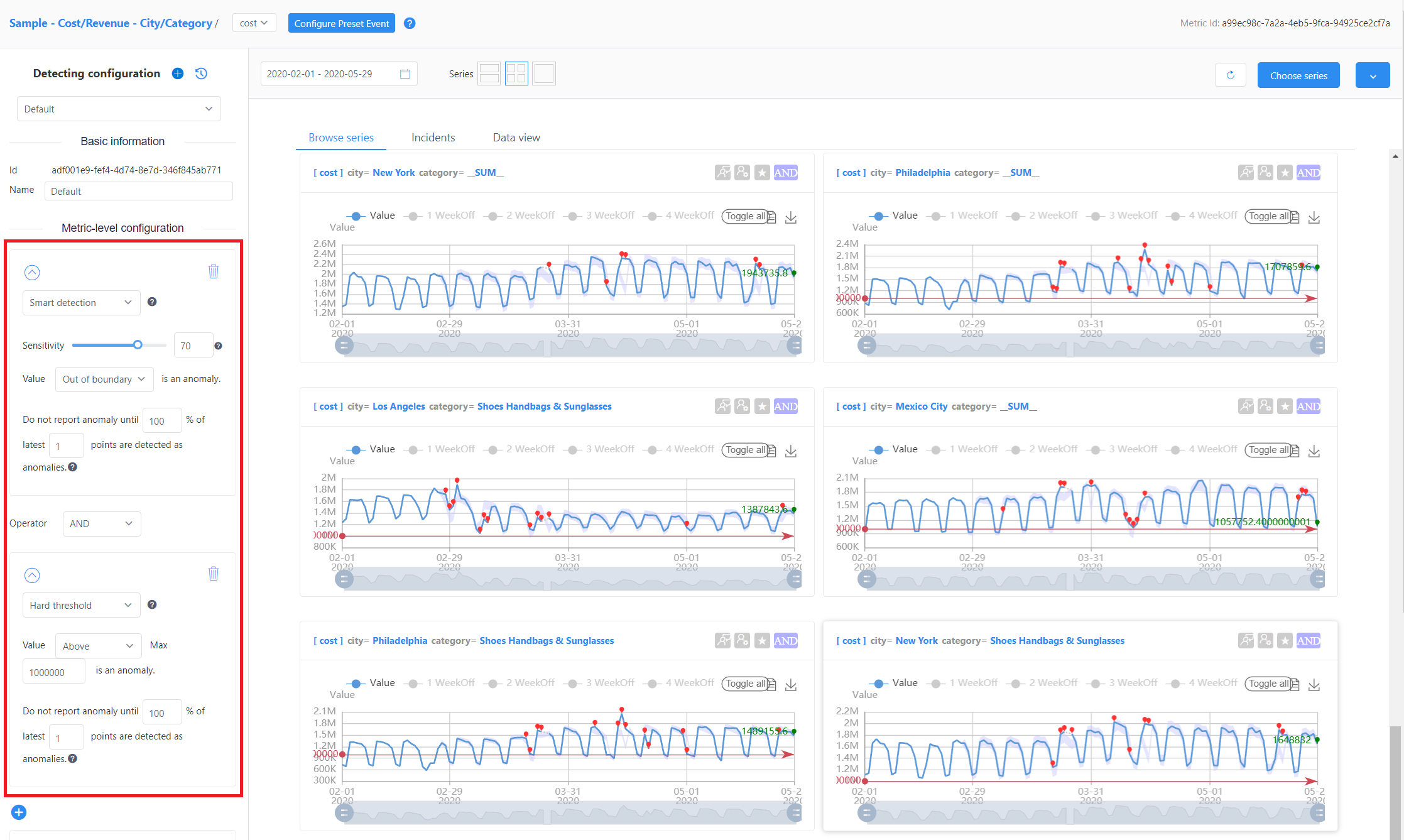 配置上述部分所述的所有设置后,系统将协调这些设置,并根据输入的首选项自动检测异常。 目标是获取适用于每个指标的最佳配置,这可使用新的自动优化功能来轻松实现。