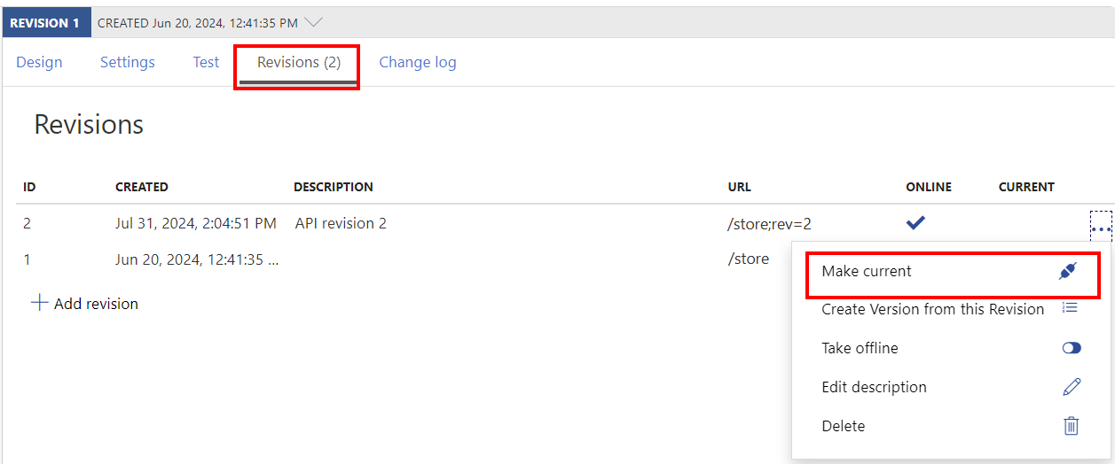 也可以在 API 上的上下文菜单 (…) 中选择“添加修订” 。