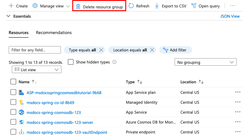 - 在“资源组”中,选择“msdocs-spring-cosmosdb-tutorial”。