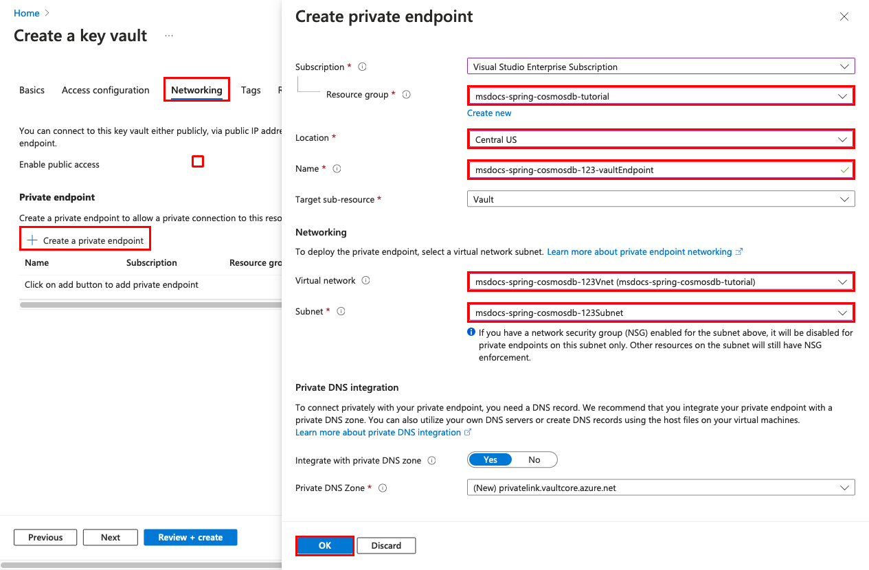 - 在“子网”中,msdocs-spring-cosmosdb-XYZSubnet。