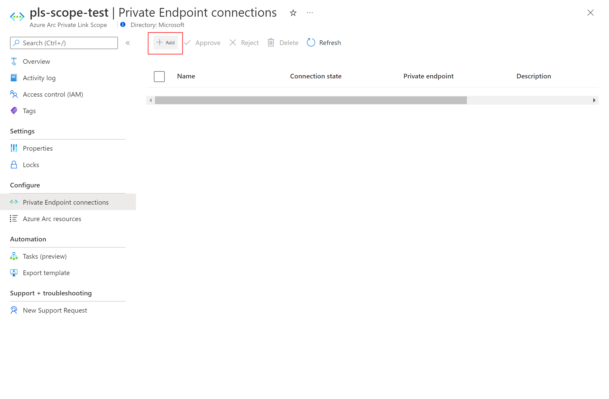 在 Azure 门户中,导航至 Azure Arc 专用链接范围资源。