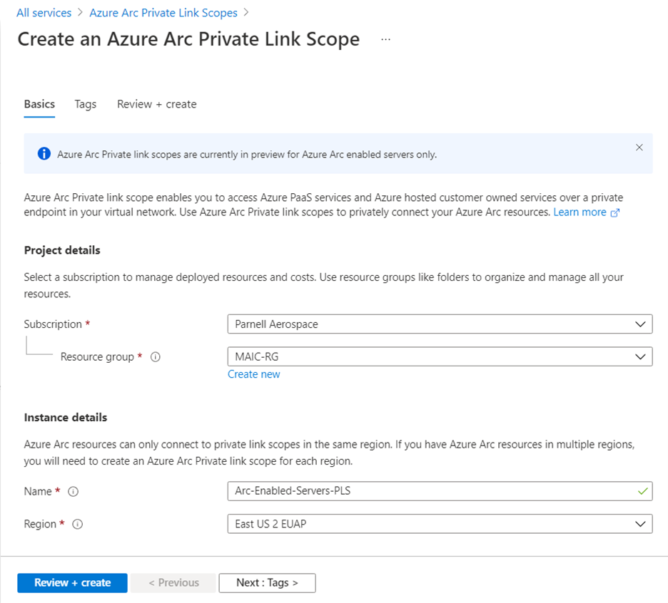 为 Azure Arc 专用链接范围指定一个名称。