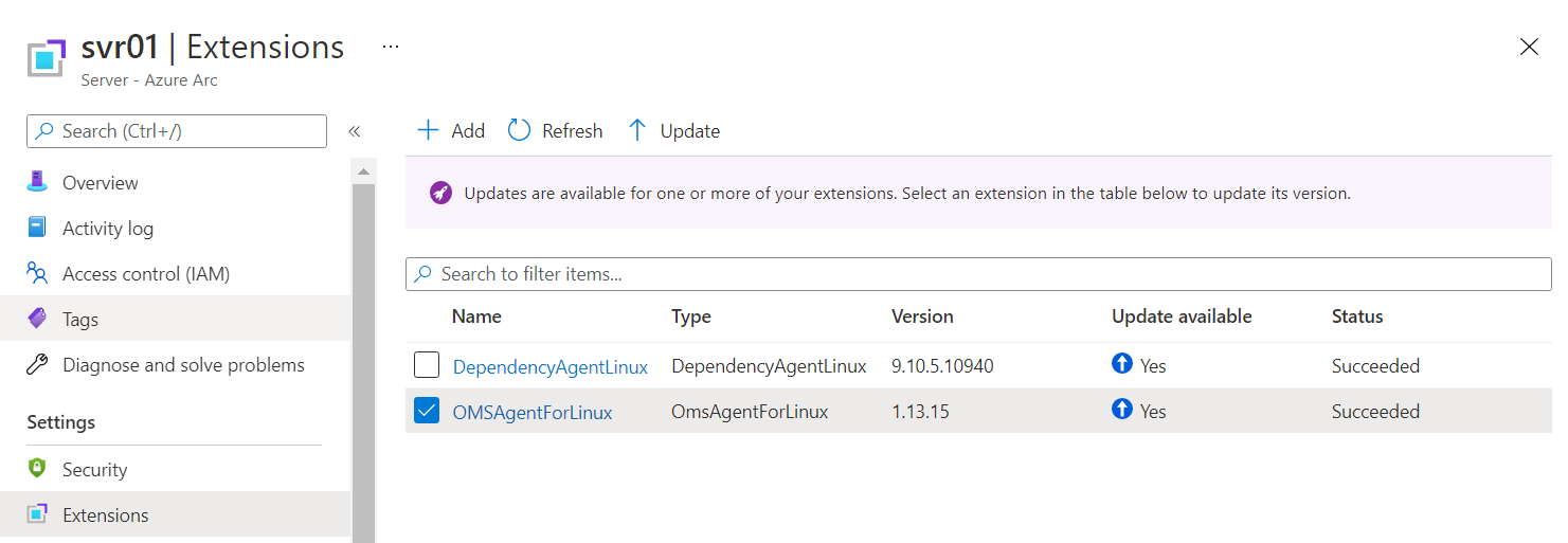 为选定的已启用 Azure Arc 的服务器查看已安装的扩展列表时,会发现一个标记为“可用更新”的列。 如果发布了较新版本的扩展,该扩展的 “更新可用 ”值将显示值为 “是”,以及新的版本号。