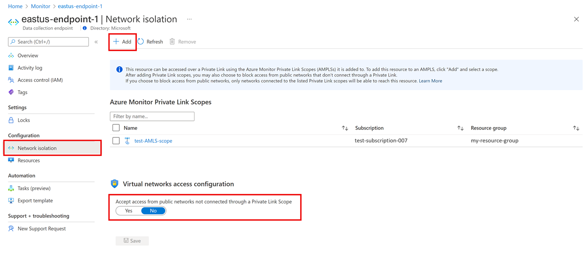 将 DCE 添加到 Azure Monitor 专用链接范围资源。 此过程会将 DCE 添加到专用域名系统 (DNS) 区域(请参阅如何验证)并允许通过专用链接进行通信。 可以从 Azure Monitor 专用链接范围资源或在现有 DCE 资源的“网络隔离”选项卡上执行此任务。