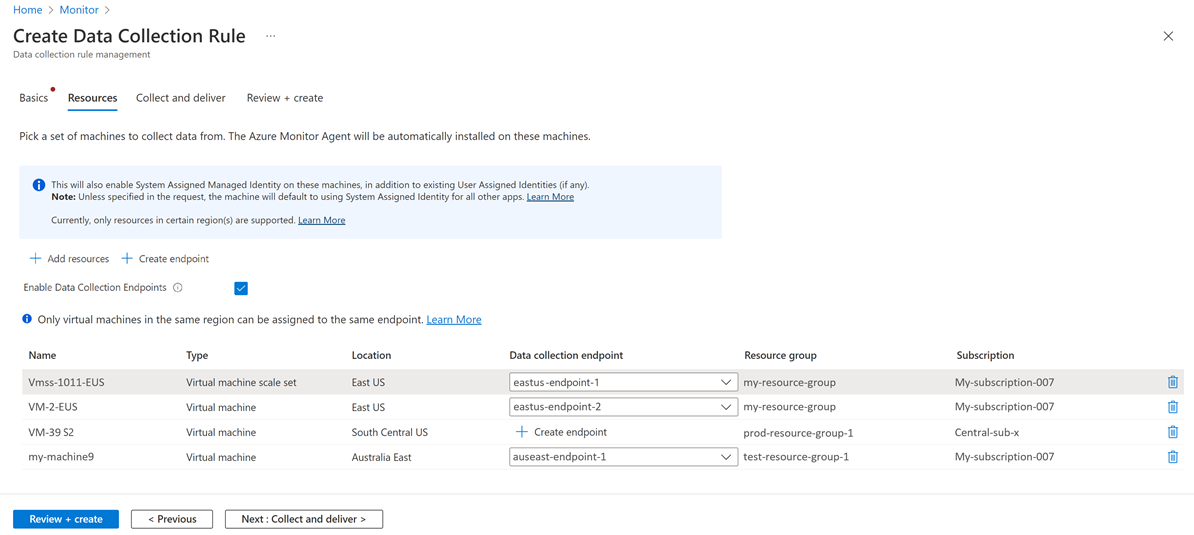 为每个区域创建一个数据收集终结点 (DCE) 来让代理连接,而不使用公共终结点。 代理只能连接到与其位于同一区域的 DCE。 如果在多个区域中有代理,请在每个相关区域中创建一个 DCE。