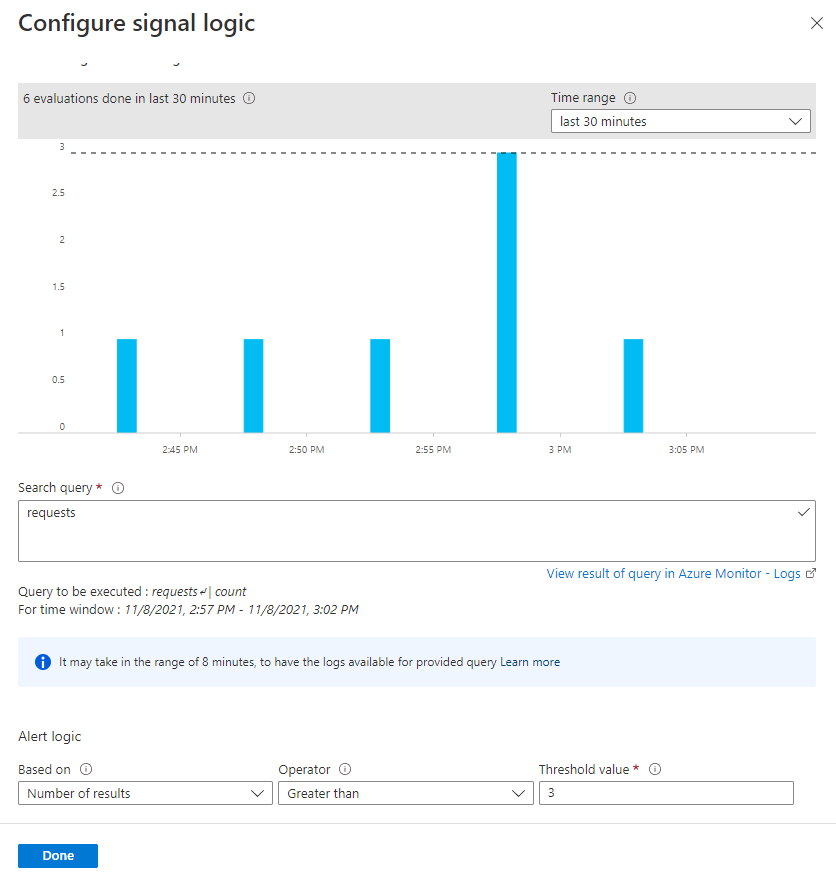 “配置信号逻辑”窗格随即打开,并且查询的历史数据将显示为图。 你可以更改图表的时间范围,以显示过去六个小时到上一周的数据。