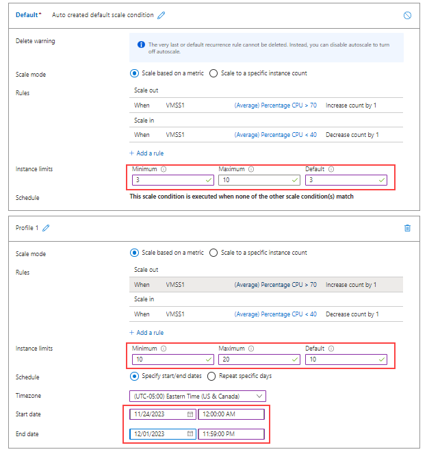 如果结束时间未包含在 CLI 命令中,则将通过使用命名约定 "name": {\"name\": \"Auto created default scale condition\", \"for\": \"<non-default profile name>\"} 创建默认配置文件的副本来实现默认结束时间 23:59。