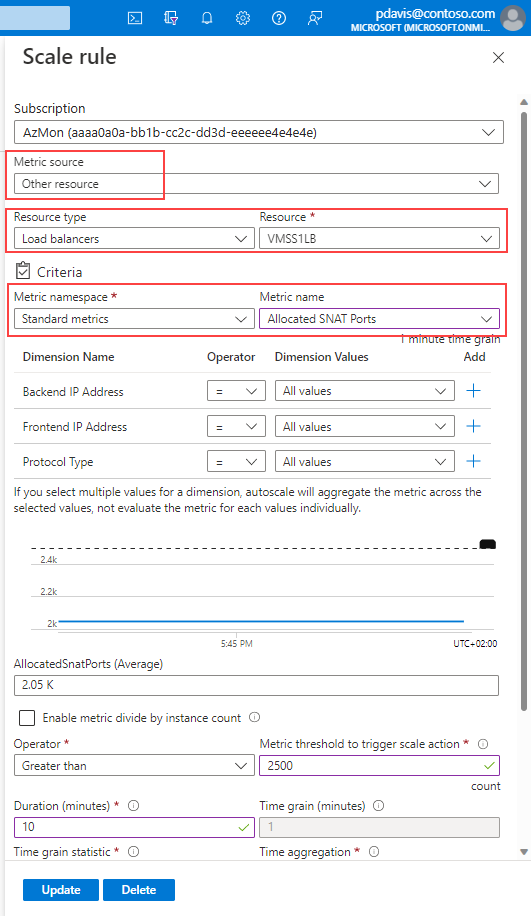 根据来自不同资源的指标缩放资源。 下图显示了一个缩放规则,它根据负载均衡器上分配的端口数缩放虚拟机规模集。