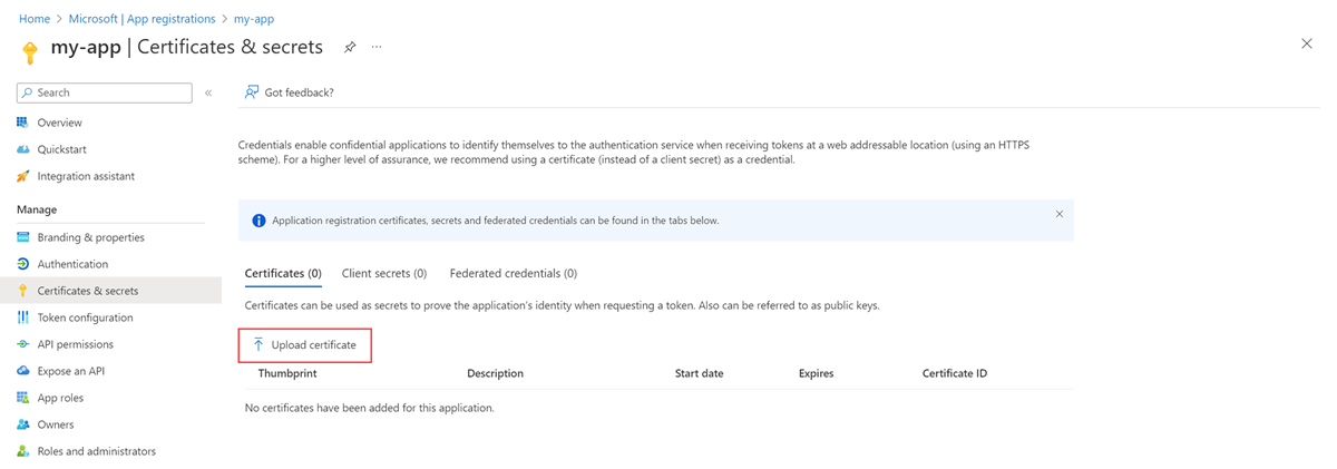 Azure Key Vault CSI 驱动程序配置只是在 Pod 上装载证书的方法之一。 远程写入容器只需要 Pod 中证书的本地路径,用于<AZURE_CLIENT_CERTIFICATE_PATH>步骤中的 值。