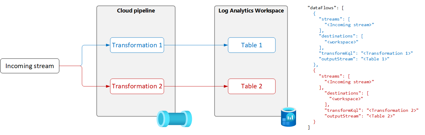 若要将单个数据源中的数据发送到多个表,请在 DCR 中创建多个数据流,每个数据流使用唯一的转换查询和输出表,如下图所示。