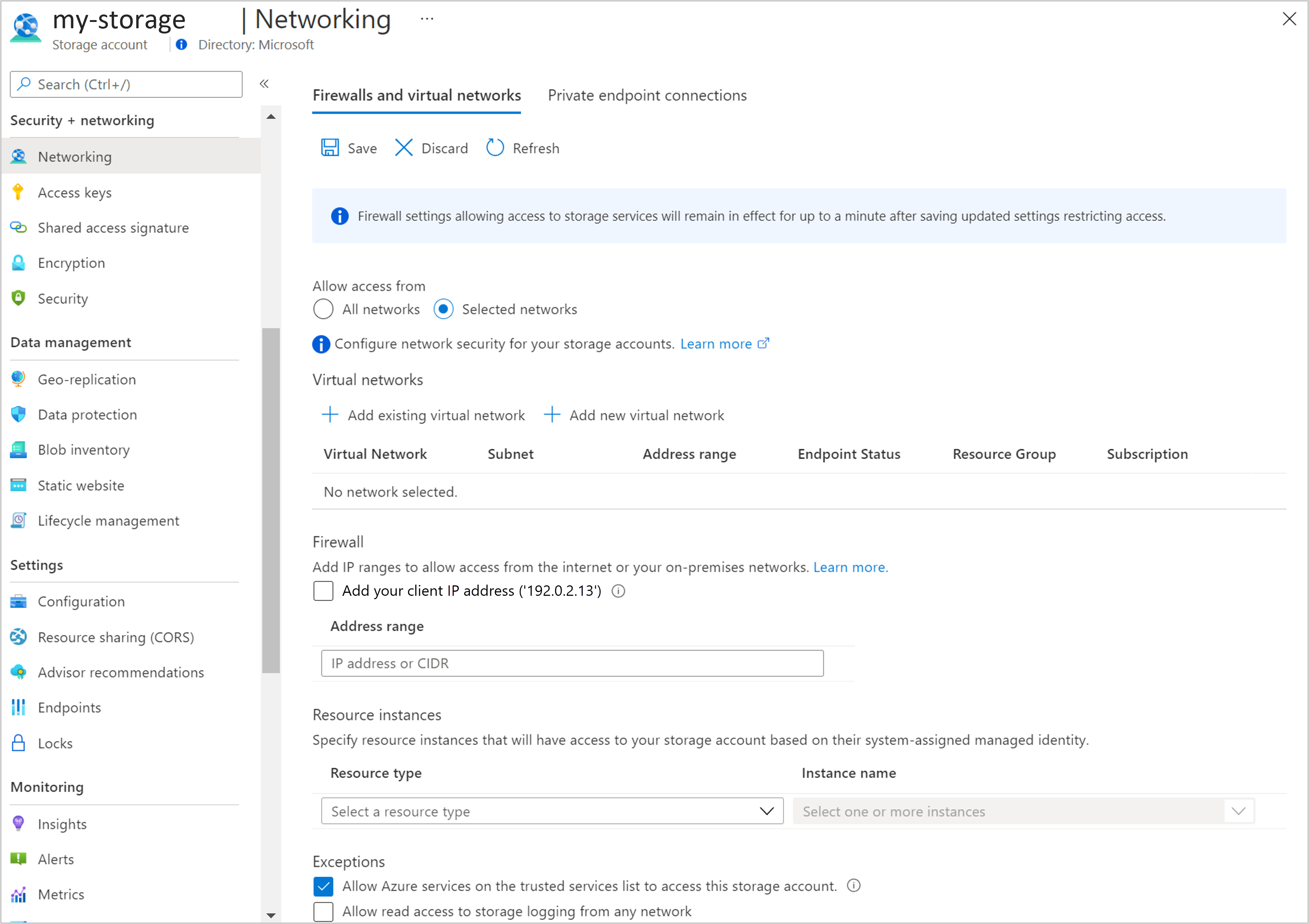 如果你已将存储帐户配置为允许从所选网络进行访问,则需要添加一个例外来允许 Azure Monitor 写入帐户。 在存储帐户的“防火墙和虚拟网络”中,选择“允许受信任服务列表中的 Azure 服务访问此存储帐户”。
