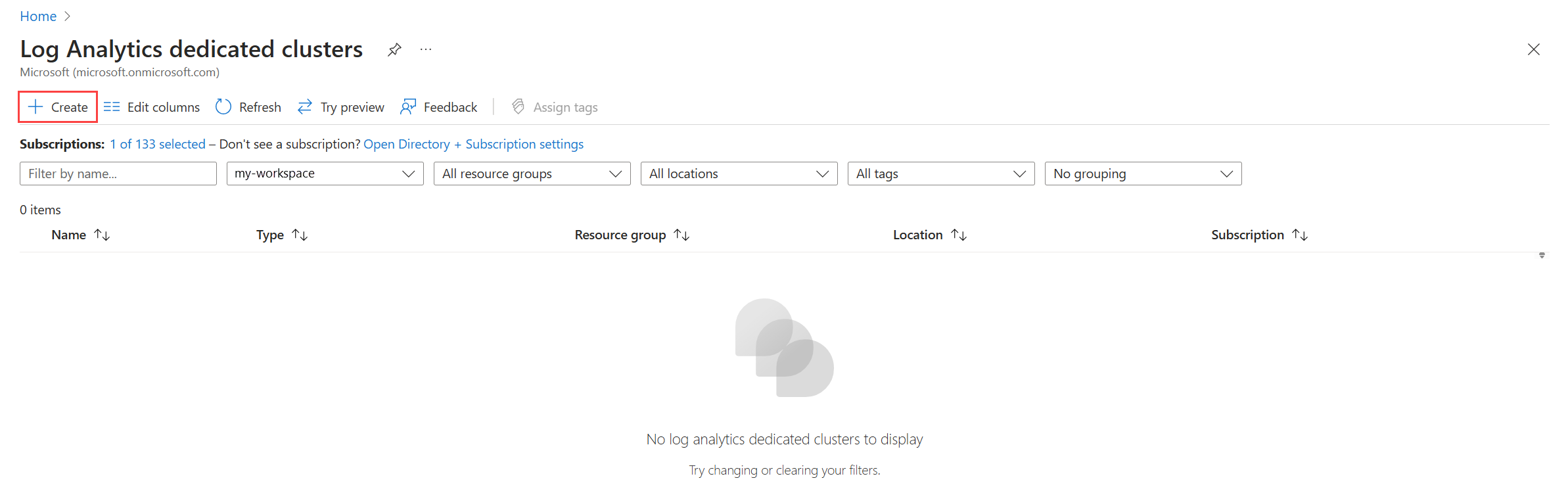 在 Azure 门户的“Log Analytics 专用群集”菜单中单击“创建”。 系统会提示你提供详细信息,例如群集名称和承诺层级。
