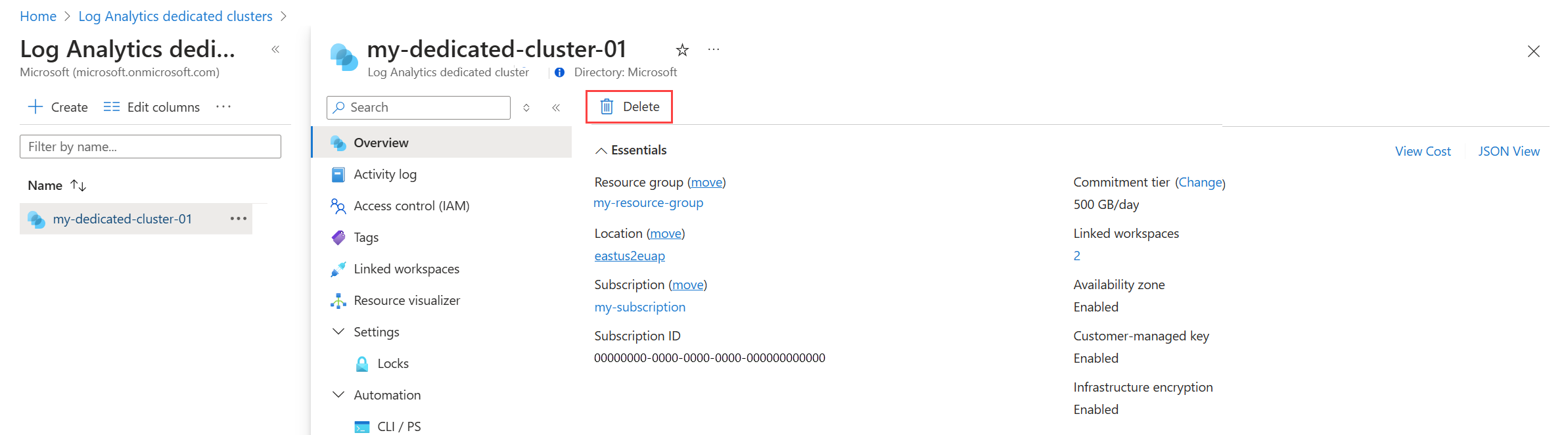 在 Azure 门户的“Log Analytics 专用群集”菜单中选择群集,然后单击“删除”。