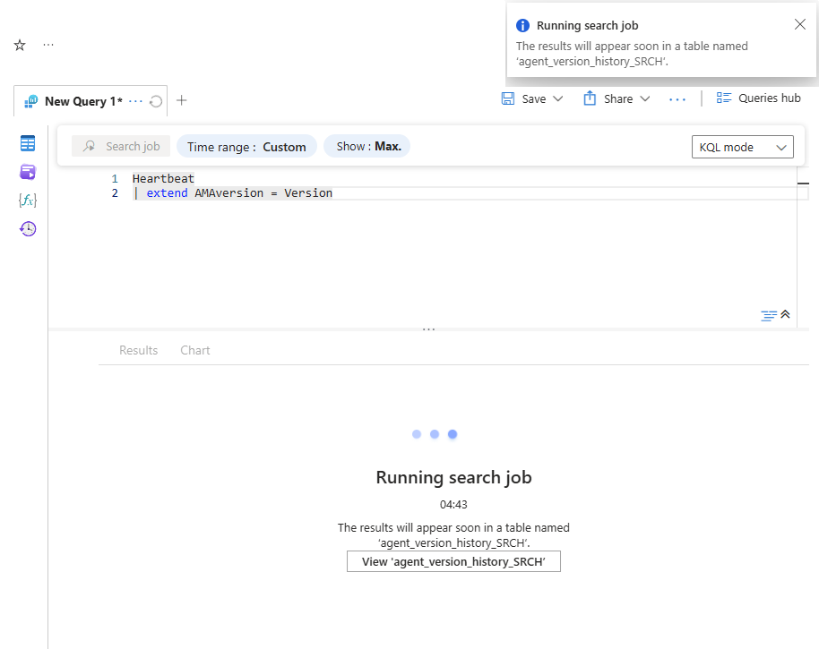 新表准备就绪后,选择 “<查看”searchtablename>_SRCH“ 以查看 Log Analytics 中的表。