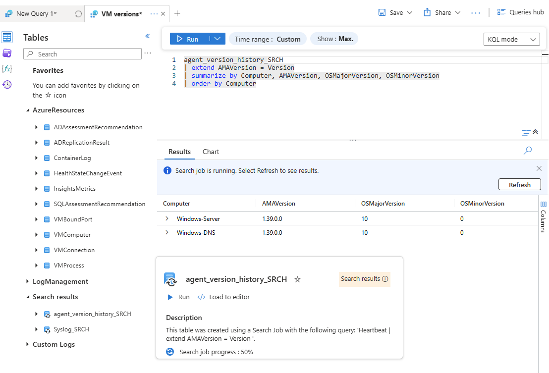 Azure Monitor 日志运行搜索作业,并在工作区中为搜索作业结果创建新表。