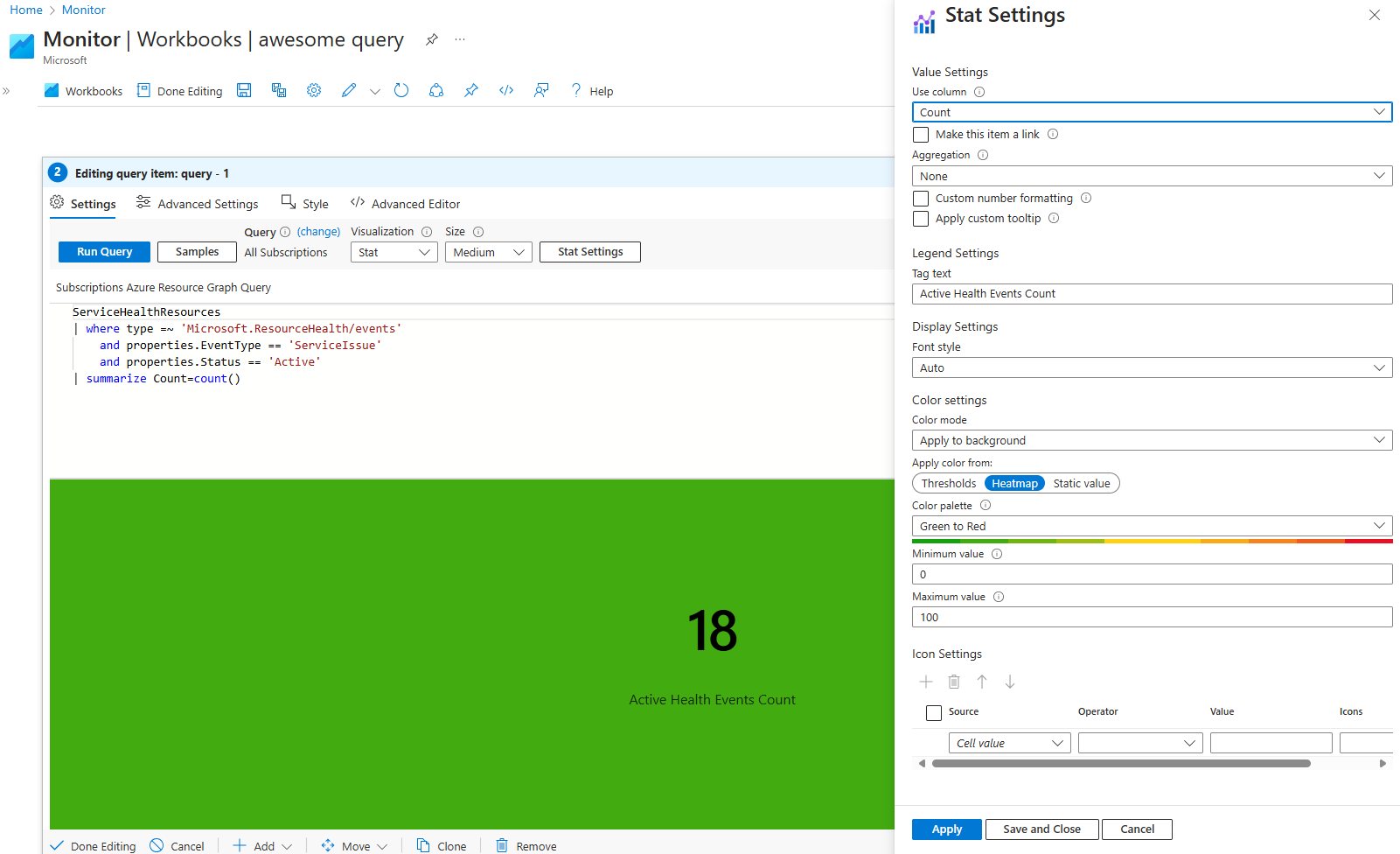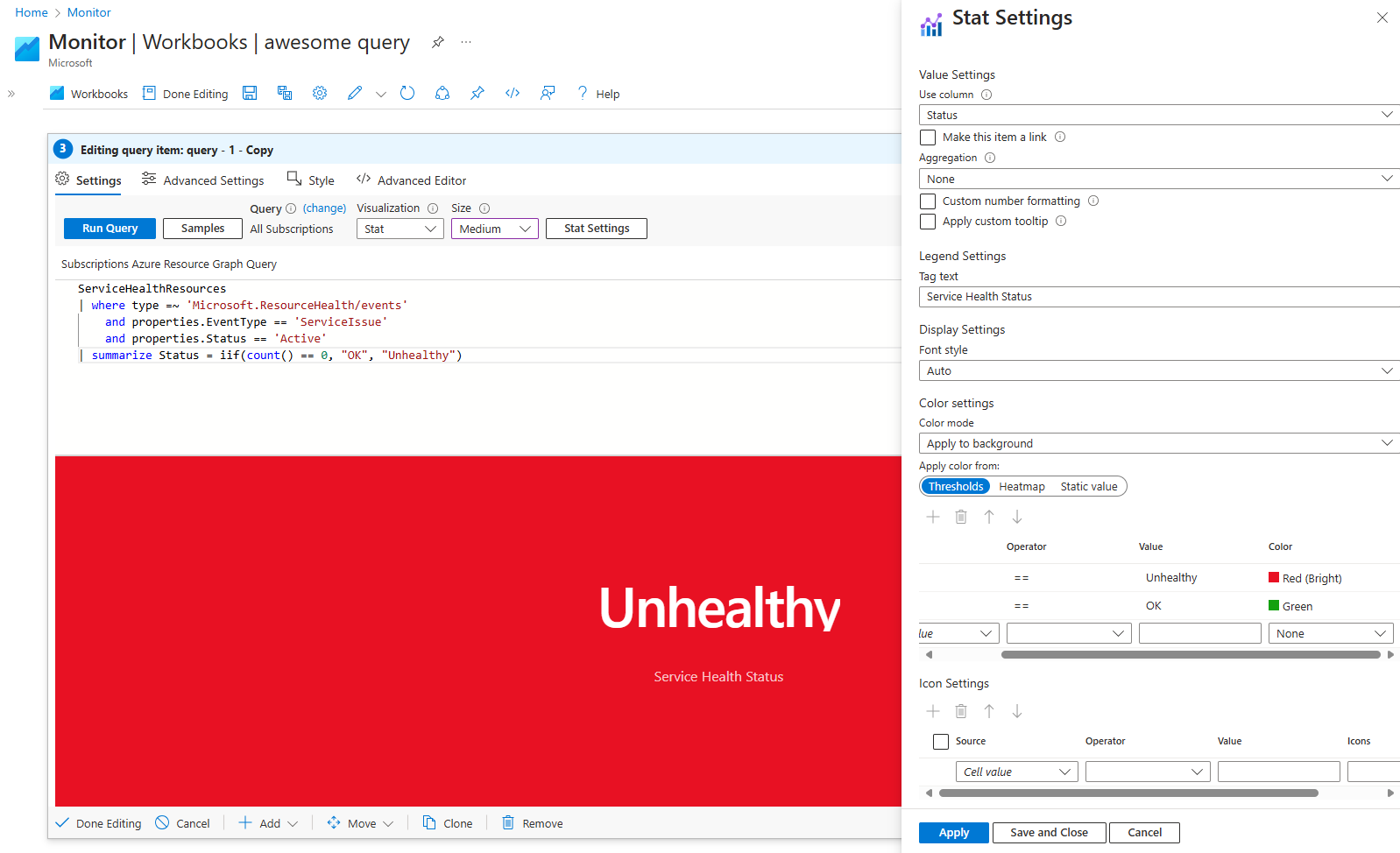 ServiceHealthResources | where type =~ 'Microsoft.ResourceHealth/events' and properties.EventType == 'ServiceIssue' and properties.Status == 'Active' | summarize Status = iif(count() == 0, "OK", "Unhealthy")将“可视化效果”设置为“统计信息”。
