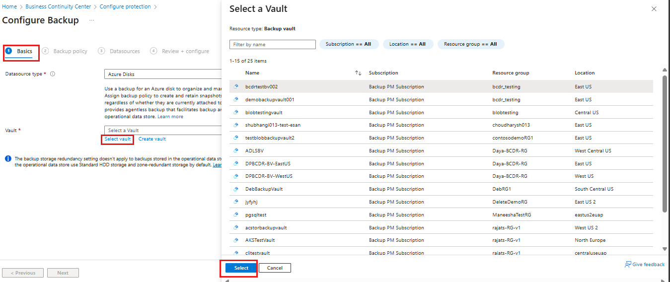 在“ 配置备份 ”窗格的“ 基本信息 ”选项卡上的 “保管库”下,单击“ 选择保管库”。