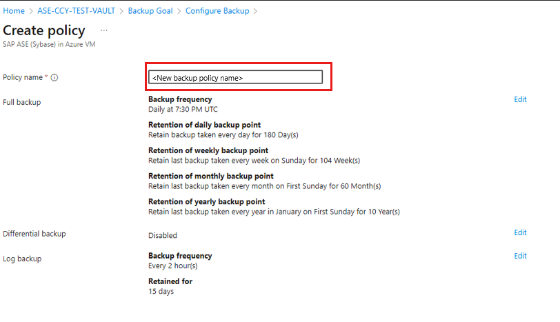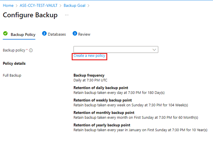在 “备份策略”下,选择“为数据库 创建新策略 ”。