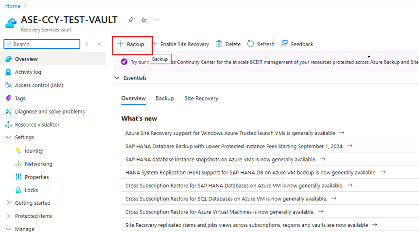 在运行 SAP ASE 的 VM 所在的同一区域和订阅中标识或创建一个恢复服务保管库。