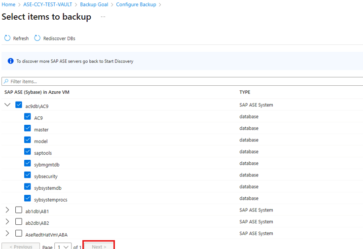 Azure 备份可发现该 VM 上的所有 SAP ASE 数据库。 在发现期间,Azure Backup 将 VM 注册到保管库,并在该 VM 上安装扩展。 不会在数据库中安装任何代理。