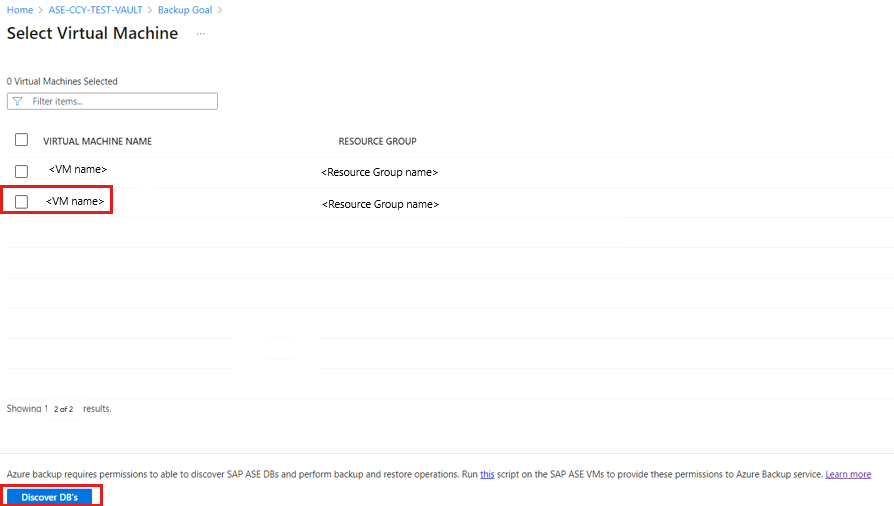 在 VM 上运行脚本后,在 “选择虚拟机 ”窗格中,选择 VM,然后选择“ 发现数据库”。
