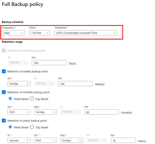 - 恢复点已根据其保留范围标记为保留。 例如,如果选择每日完整备份,则每天只触发一次完整备份。