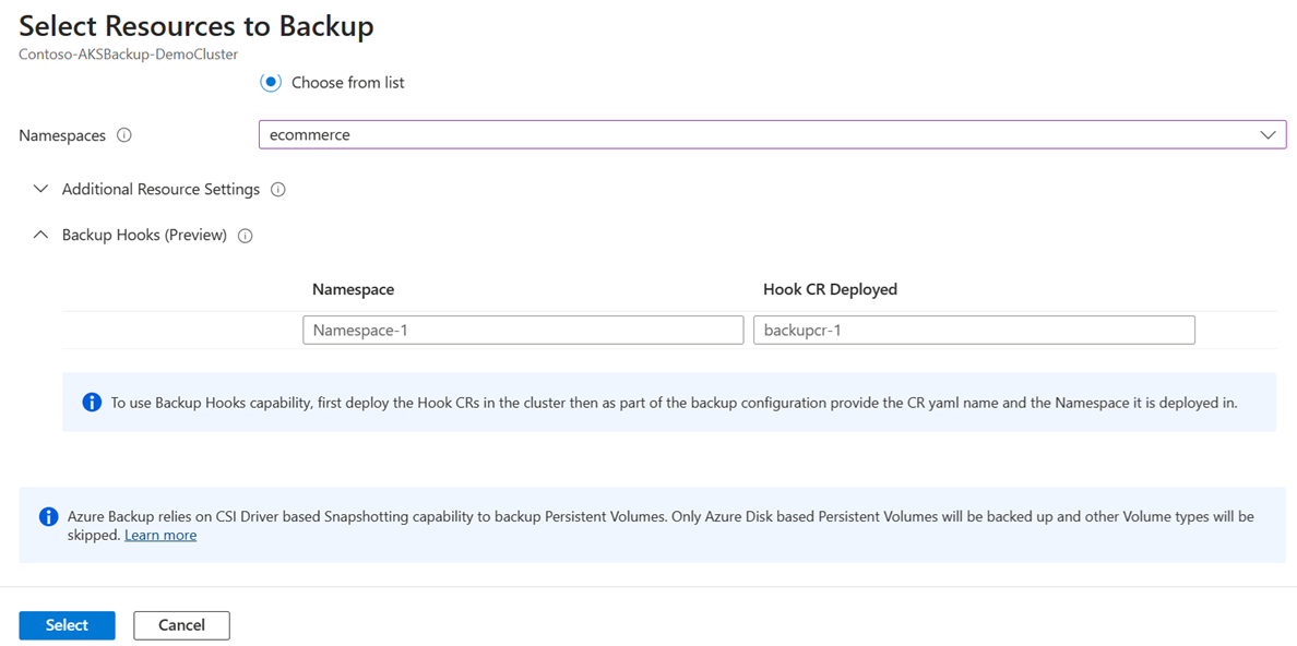 对于“选择要备份的命名空间”,可以选择“全部”来备份群集中的所有现有和将来的命名空间,也可以选择“从列表中选择”以选择特定命名空间来进行备份。