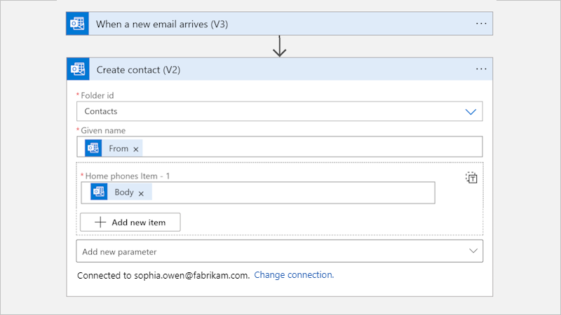 参数 必须 值 说明 Folder Id 是 联系人 该操作用于创建新联系人的文件夹 名字 是 <contact-name 为联系人使用的名称 住宅电话 是 <home-phone-number 联系人的住宅电话号码 此示例选择相关操作用于创建新联系人的“联系人” 文件夹,并将触发器的输出用于其余参数值: