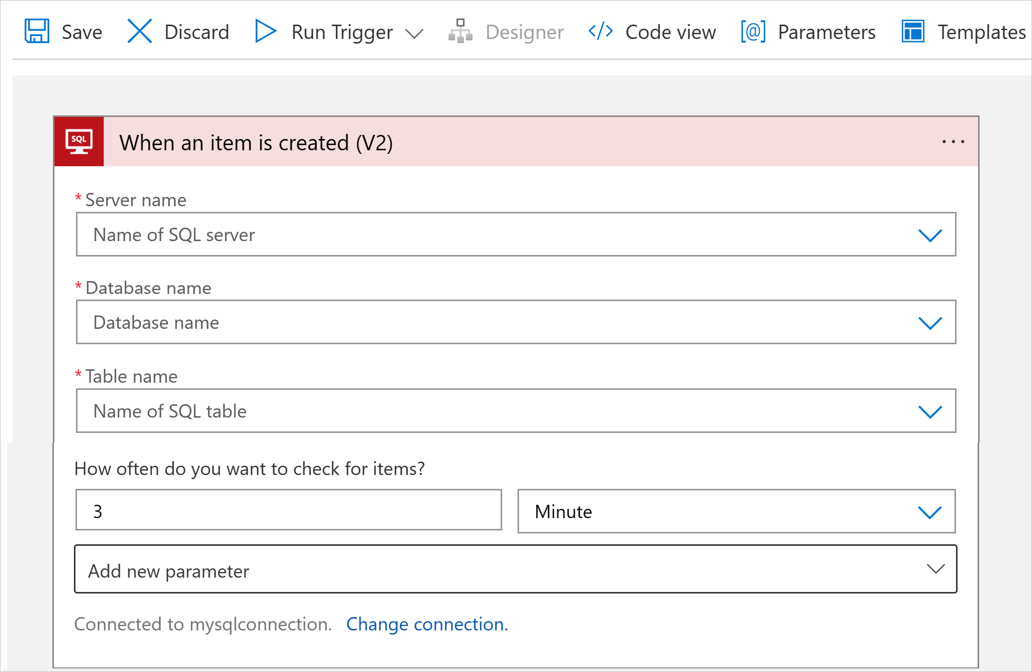 对于此示例,在名为 When an item is created 的触发器中,提供 SQL Server 名称和数据库名称的值(如果以前未提供)。 否则,请从“表格名称”列表中选择要使用的表格。 选择“频率”和“间隔”,以设置触发器检查新项目的计划。