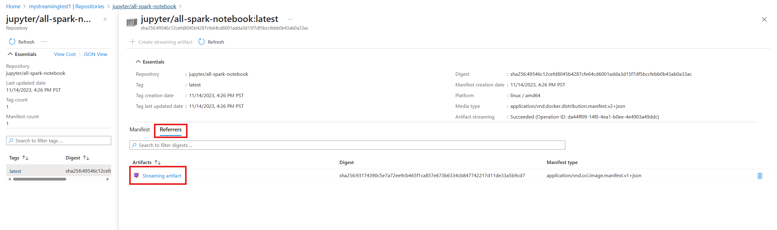 jupyter/all-spark-notebook:latestACR 中mystreamingtest映像的流项目。az acr manifest list-referrers -n jupyter/all-spark-notebook:latest取消项目流式处理创建(如果需要)