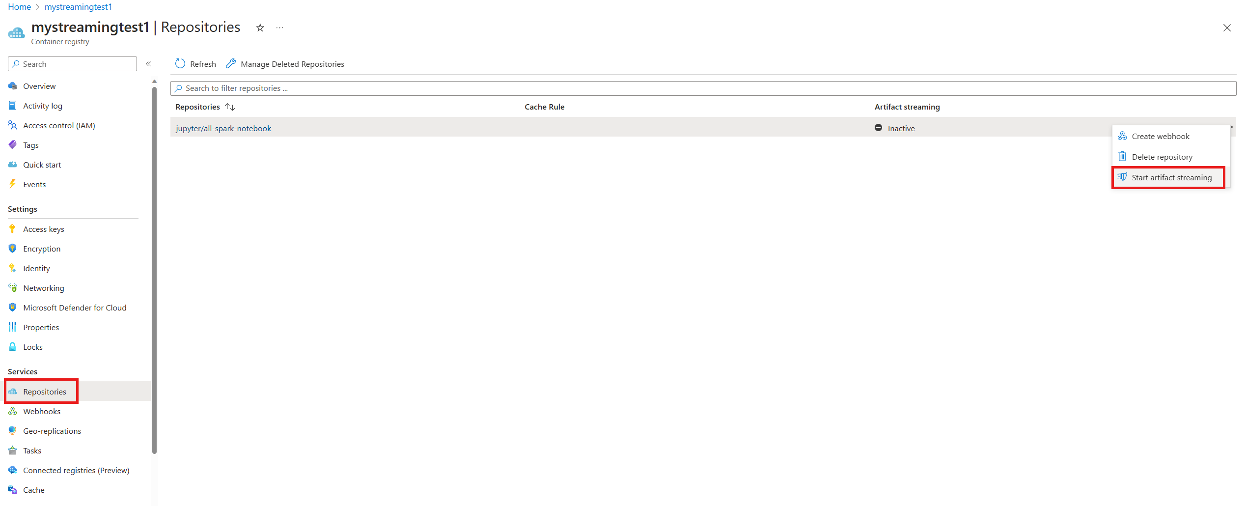 jupyter/all-spark-notebook:latestACR 中删除mystreamingtest映像的流项目。az acr artifact-streaming update --repository jupyter/all-spark-notebook --enable-streaming false
