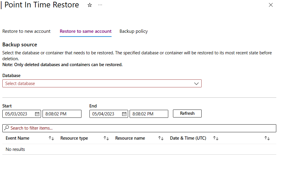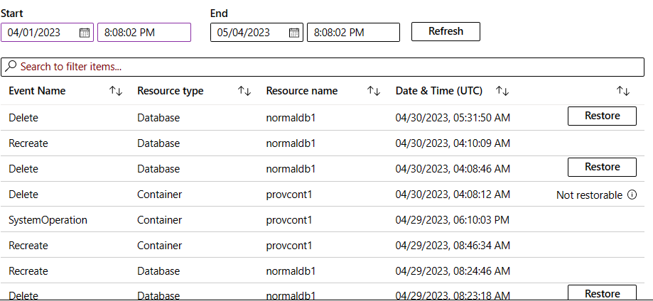 通过列出所有可还原数据库删除事件,可在存在的实际时间未知的情况下选择正确的数据库。 如果事件源的响应中包含 Delete 操作类型,则表示它是已删除的数据库,可在同一帐户中还原该数据库。 还原时间戳可以设置为删除时间戳之前且在保留时段内的任何时间戳。