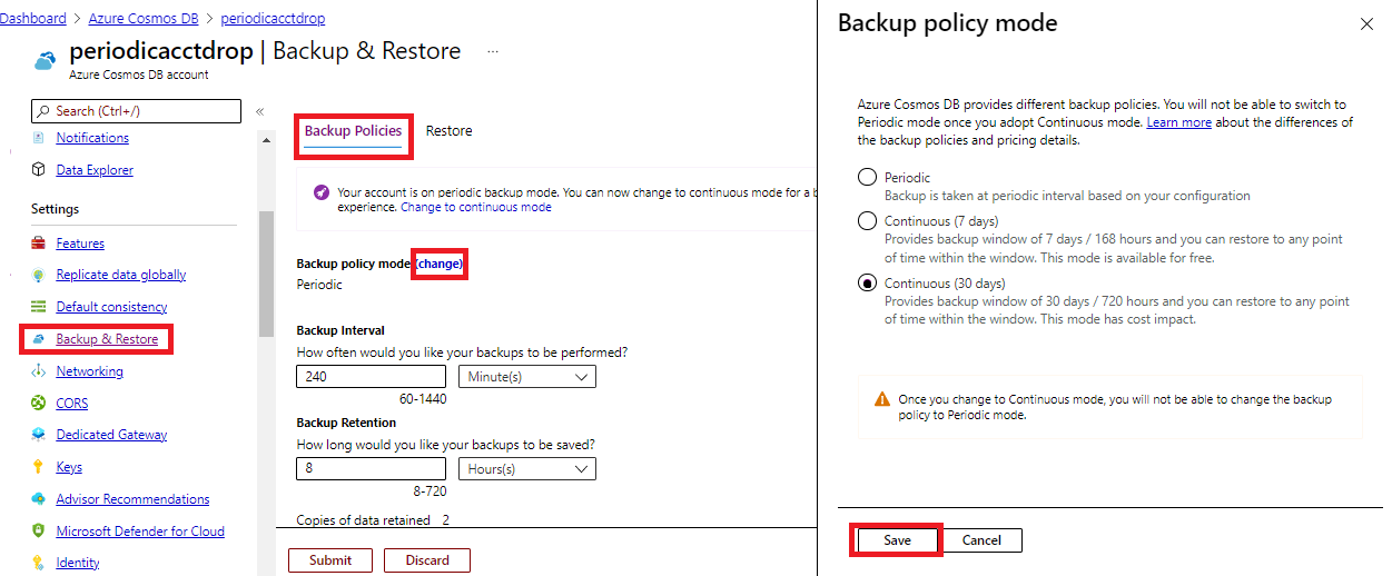 使用以下步骤将帐户从周期备份迁移到连续备份模式:
