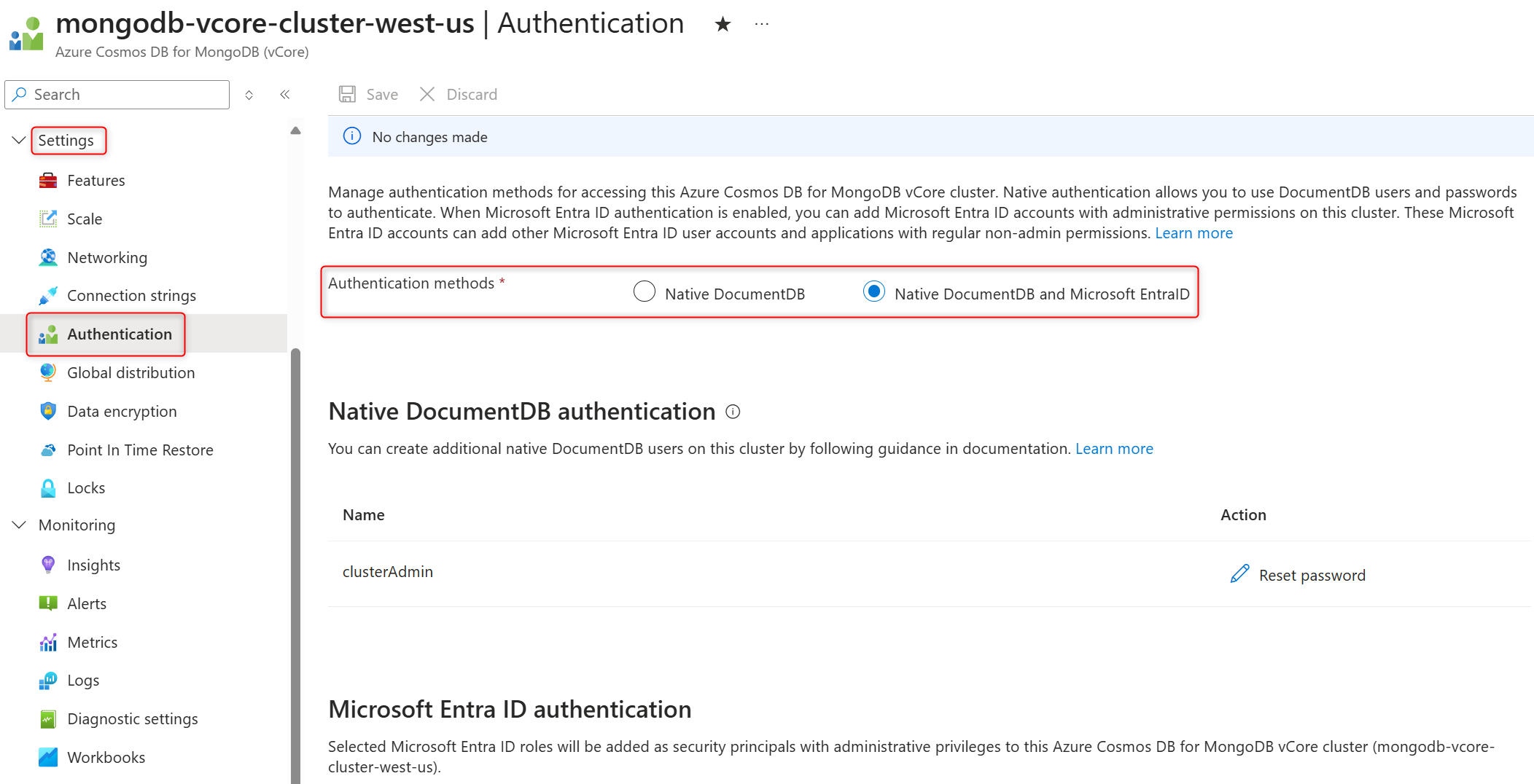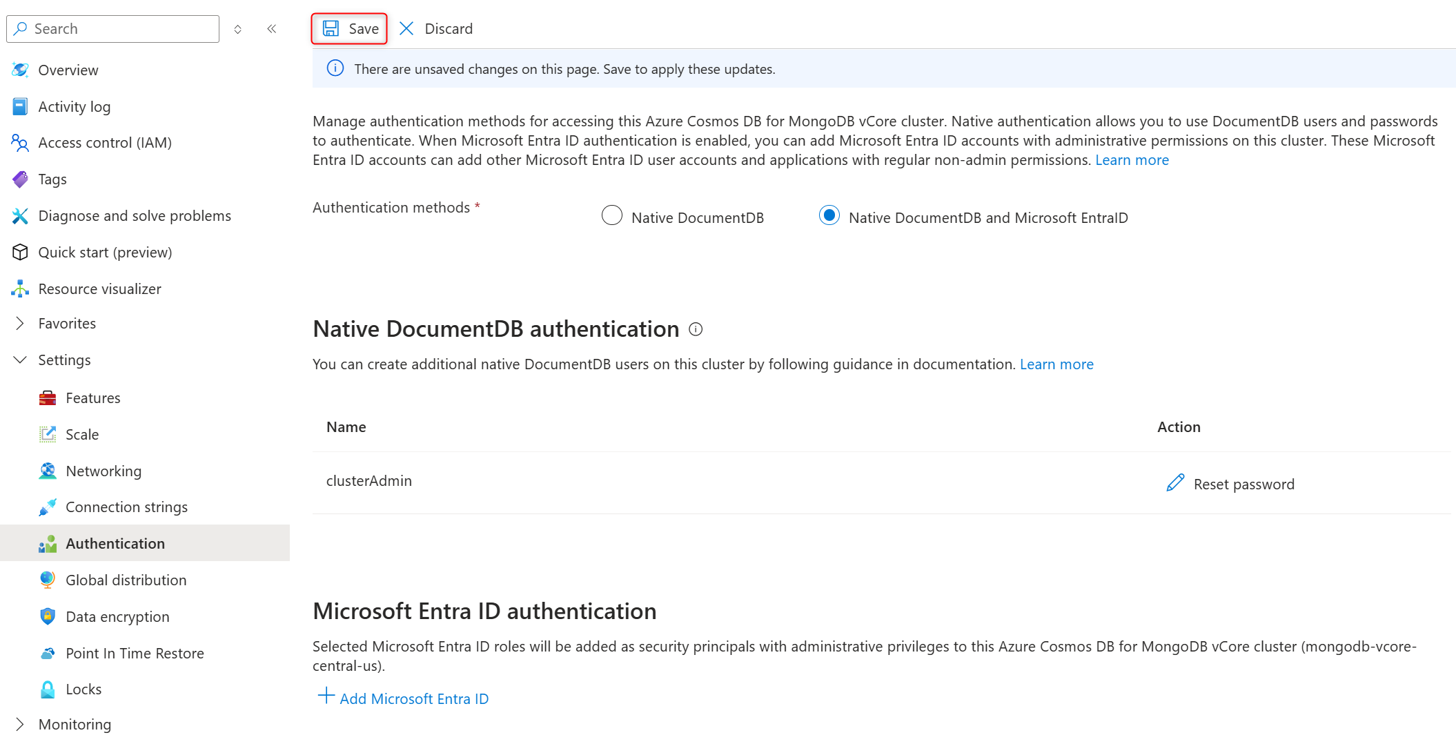 在 “身份验证方法” 部分中,选择 “本机 DocumentDB 和 Microsoft Entra ID” 以启用 Microsoft Entra ID 身份验证。