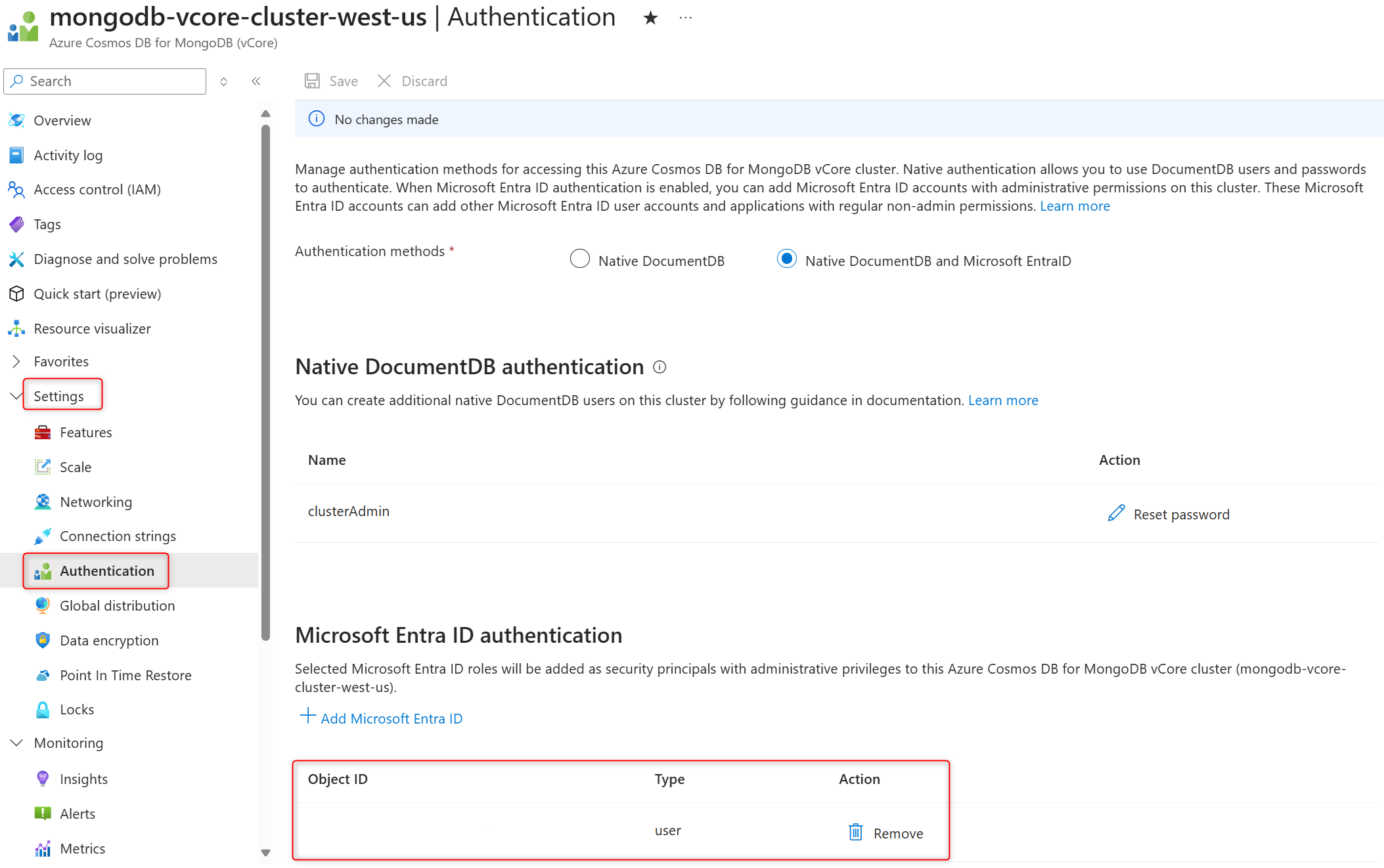 使用此命令删除本机 DocumentDB 身份验证方法,并将 Microsoft Entra ID 身份验证方法添加到群集:
