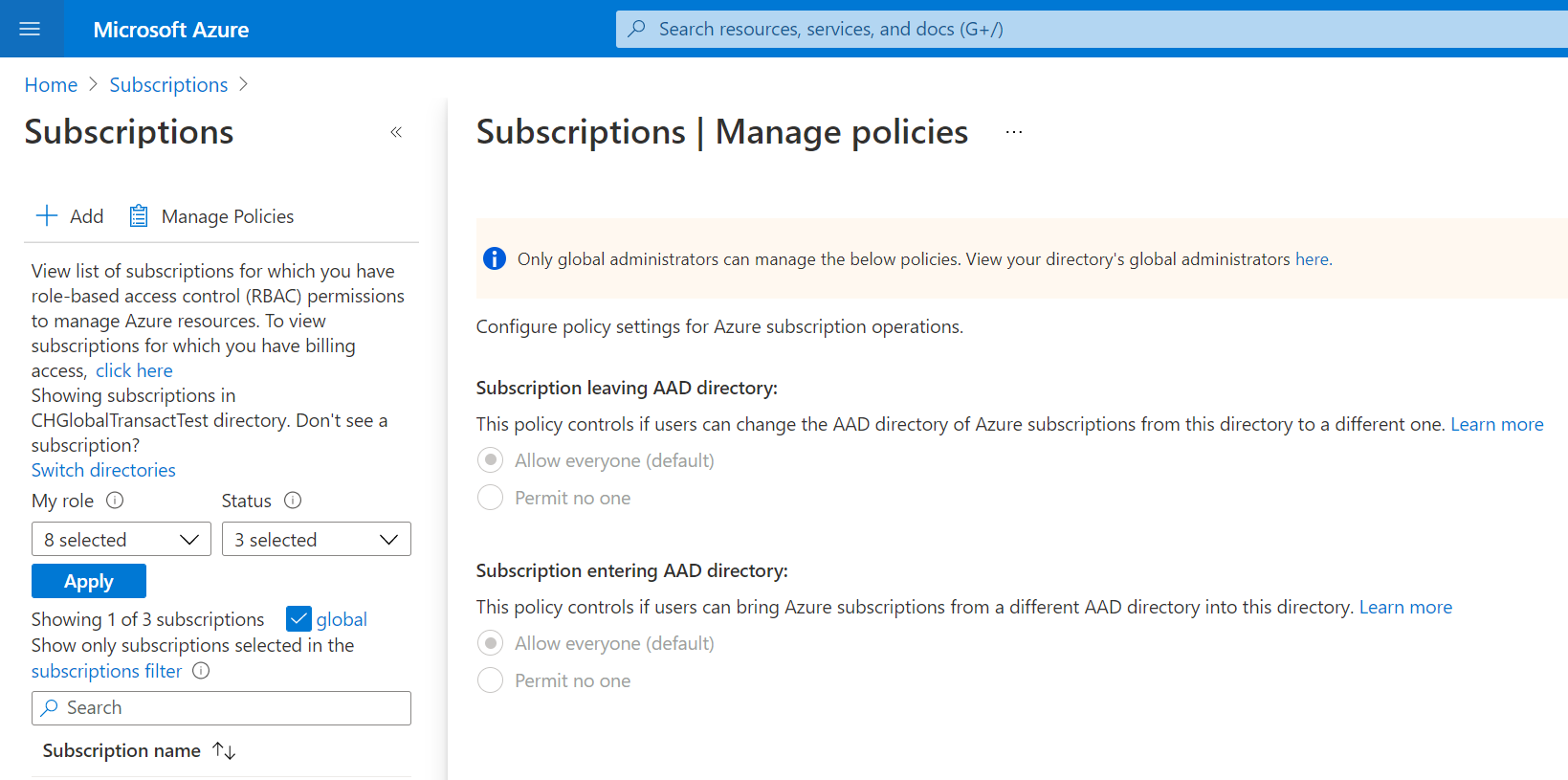 本文帮助您配置 Azure 订阅策略,以控制 Azure 订阅在目录之间的移动。 这两个策略的默认行为设置为 “允许所有人”。 请注意,“允许所有人”设置允许所有授权用户,包括订阅中已授权的来宾用户,能够进行转移操作。 这并不意味着所有目录用户。